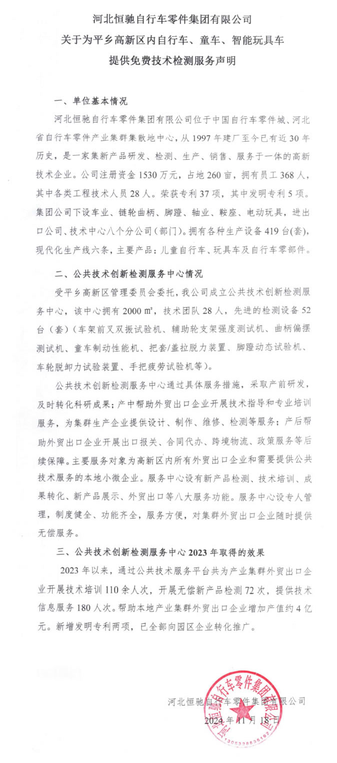 为平乡高新区内自行车相关企业提供免费技术检测服务声明